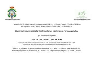 La Academia de Medicina de Extremadura (AMedEx) y el Ilustre Colegio Oficial de Médicos de Cáceres organizan una nueva cita científica que tendrá lugar el jueves, 16 de octubre de 2025, a las 18:00 horas, [...]