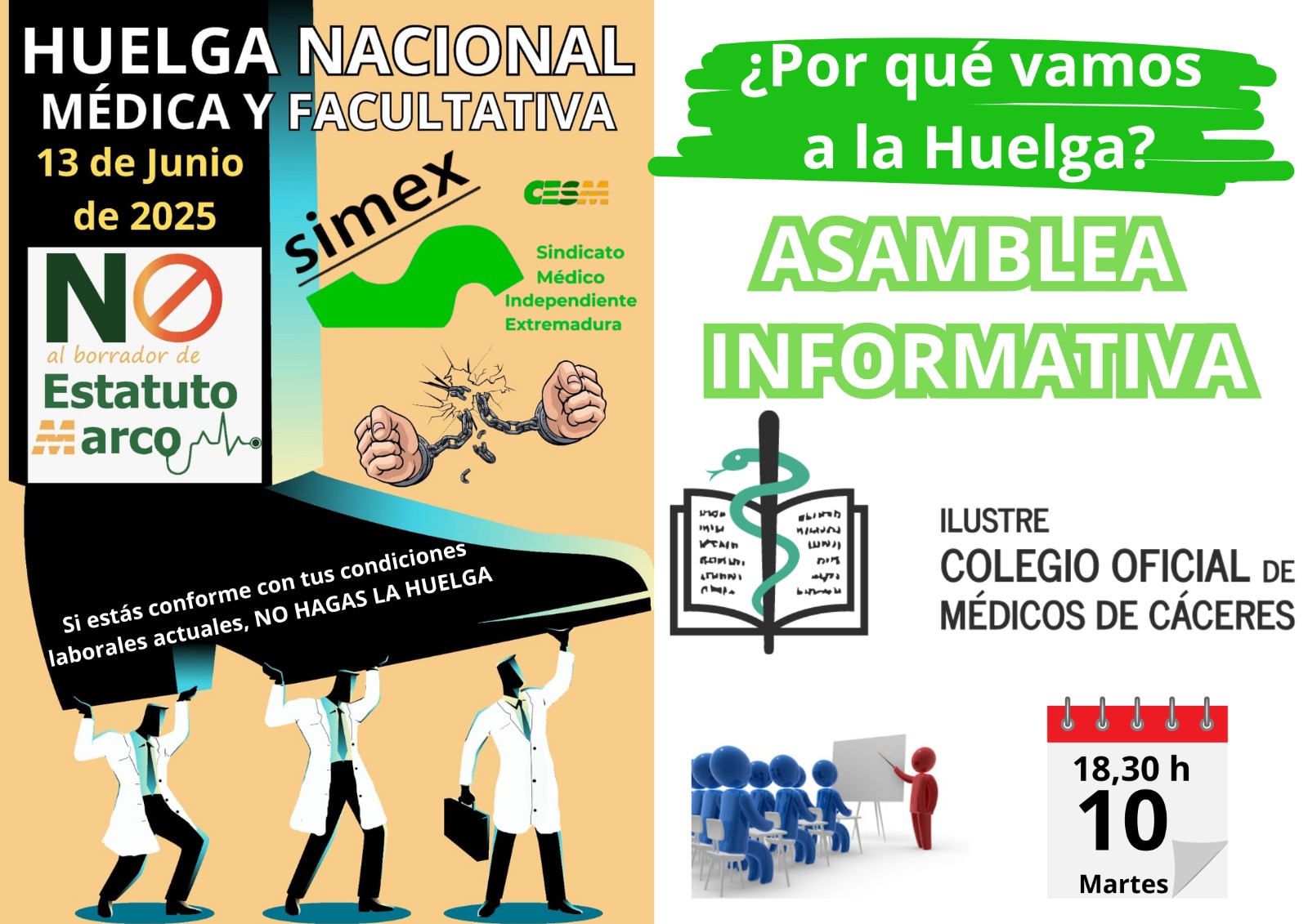 El Sindicato Médico de Extremadura (SIMEX) convoca a todos los médicos y médicas a una asamblea informativa que se celebrará el próximo martes, 10 de junio a las 18:30 horas, en la sede del Colegio de Médicos. El objetivo del encuentro es informar detalladamente sobre los motivos y la organización de la huelga nacional prevista para el viernes 13 de junio, en protesta contra el anteproyecto de ley del nuevo Estatuto Marco del Personal del Sistema Nacional de Salud, presentado recientemente por el Ministerio de Sanidad.