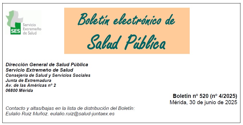El Servicio Extremeño de Salud, a través de la Dirección General de Salud Pública, ha publicado el número 520 del Boletín Electrónico de Salud Pública de Extremadura, con fecha 30 de junio de 2025. Este boletín ofrece una selección de temas relevantes para los profesionales sanitarios, con enlaces directos a fuentes oficiales y científicas actualizadas.
