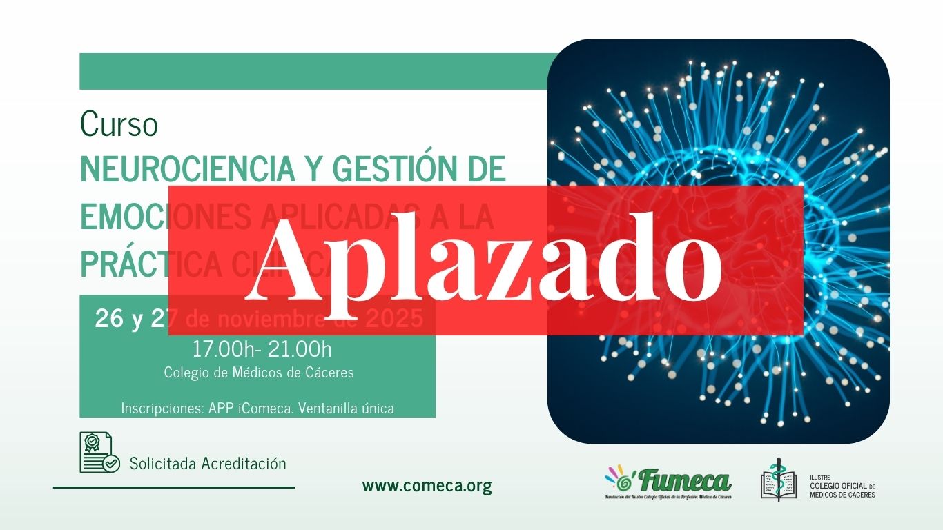 El curso de “Neurociencia y Gestión de Emociones” previsto para celebrarse los días 26 y 27 de noviembre de 2025 en la sede del Colegio de Médicos de Cáceres, ha sido aplazado.