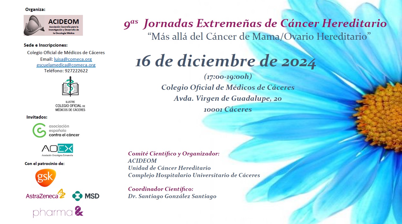 Las 9as Jornadas Extremeñas de Cáncer Hereditario “Más allá del Cáncer de Mama/Ovario Hereditario” se celebrará el 16 de diciembre de 17h a 19h en la sede del Colegio de Médicos de Cáceres. Durante esta actividad coordinada por el Dr. Santiago González Santiago, se hablará del estudio genético desde la toma de muestra hasta el [...]