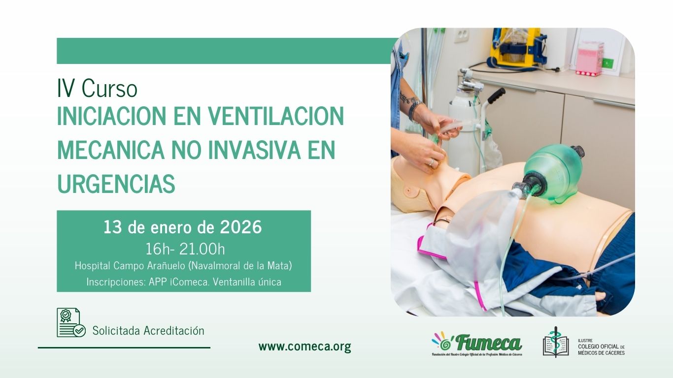 La Fundación del Colegio de Médicos de Cáceres organiza el IV Curso de Iniciación en Ventilación Mecánica No Invasiva (VMNI) en Urgencias, que tendrá lugar el 13 de enero en el Hospital Campo Arañuelo de Navalmoral de la Mata. Día y hora: 13 de enero de 16h - 21.00h. Lugar: Hospital Campo Arañuelo de Navalmoral de [...]
