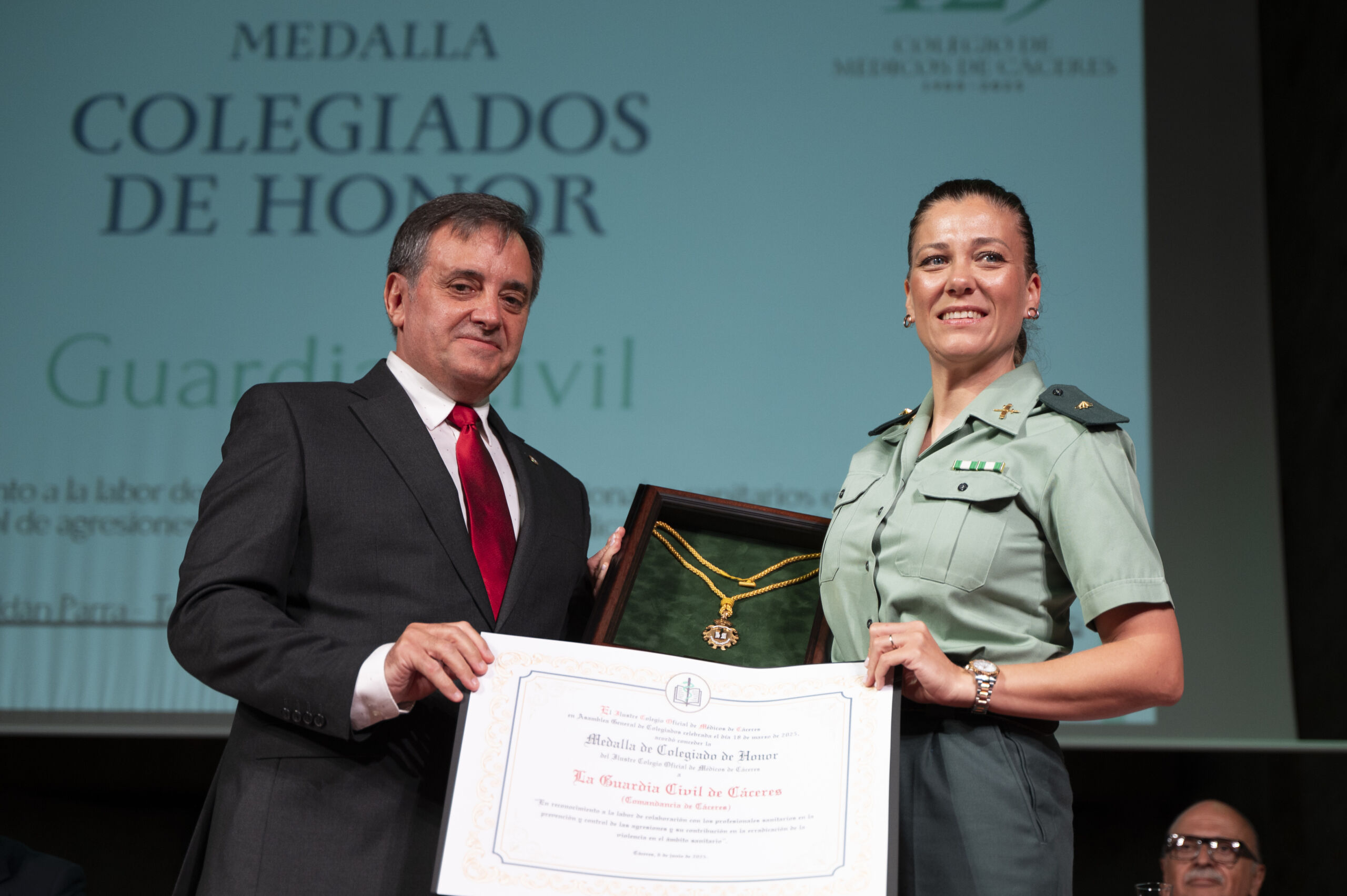 La Guardia Civil y la Policía Nacional recibieron la distinción de Colegiados de Honor por su reconocimiento a la labor de colaboración con los profesionales sanitarios en la prevención y control de las agresiones y su contribución en la erradicación de la violencia en el ámbito sanitario.