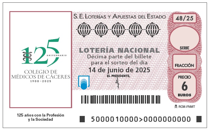 Loterías y Apuestas del Estado dedica el décimo del sorteo de la Lotería Nacional de este sábado, 14 de junio, al Ilustre Colegio Oficial de Médicos de Cáceres, con motivo de la conmemoración de su 125º aniversario (1900-2025). Esta iniciativa supone un reconocimiento al compromiso de la institución con la profesión médica y con la sociedad cacereña.