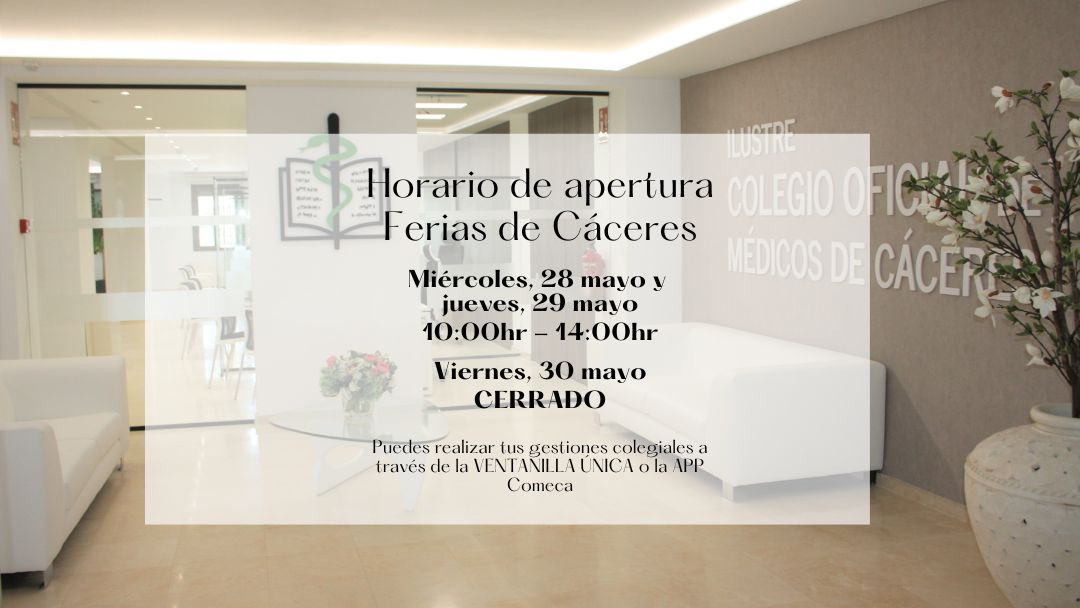 Con motivo de la celebración de la Feria de San Fernando de Cáceres, las oficinas del Colegio de Médicos cambiará temporalmente su horario de atención al público. El horario de apertura será de 10.00 a 14.00 horas miércoles 28 y jueves 29, permaneciendo cerrado el viernes día 30 al ser fiesta local en la ciudad.