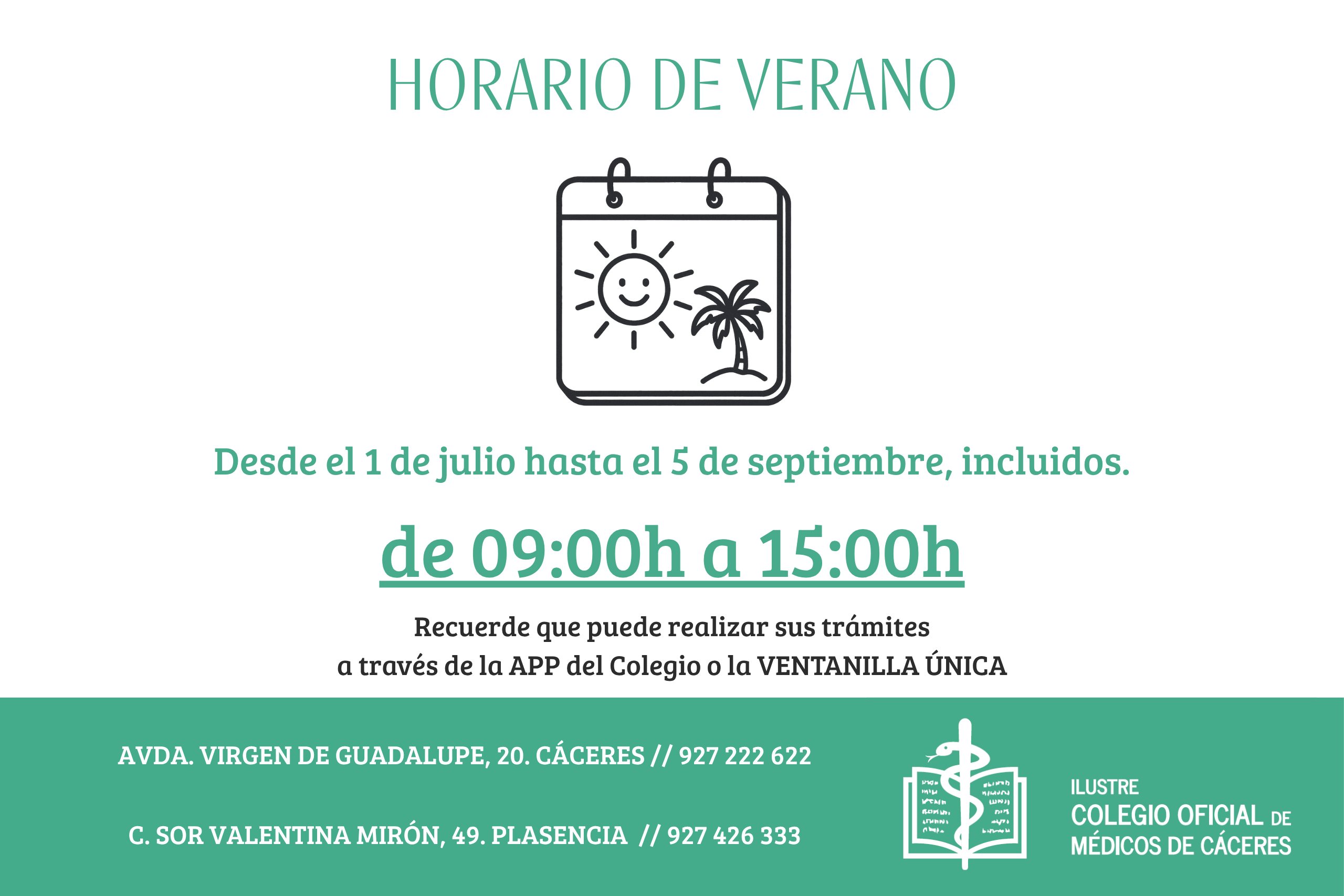 Debido al periodo estival, las sedes del Colegio de Médicos de Cáceres y Plasencia cambian su horario de apertura al público.