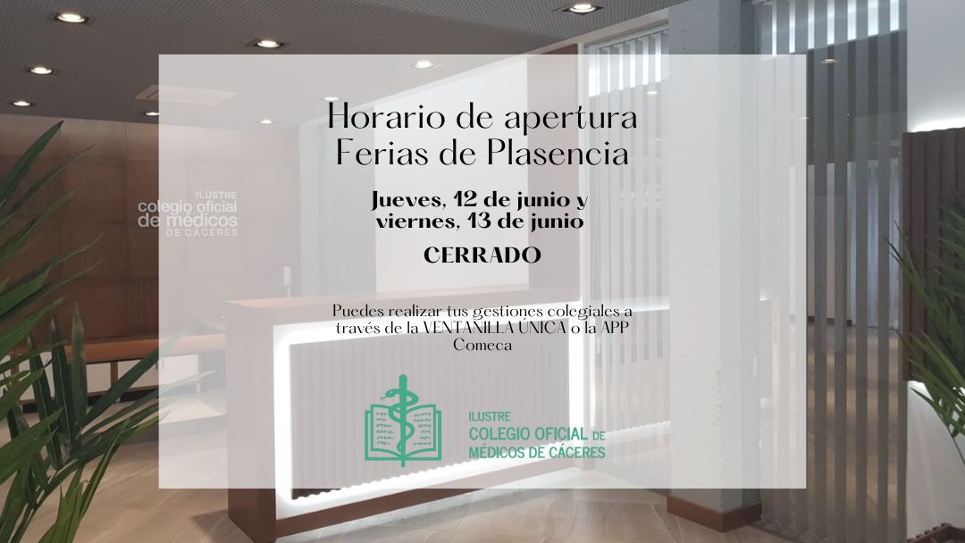La delegación del Colegio de Médicos en Plasencia permanecerá cerrada el jueves, 12 de junio, y el viernes día 13.