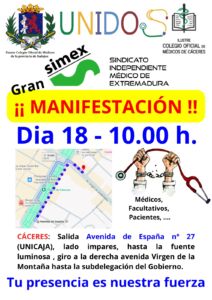El Sindicato Médico de Extremadura (SIMEX), con el apoyo del Colegio Oficial de Médicos de Cáceres y el Colegio Oficial de Médicos de Badajoz,  ha convocado una manifestación que tendrá lugar el próximo miércoles, día 18 a las 10:00 horas en Cáceres para pedir un Estatuto Marco propio y mejoras laborales.