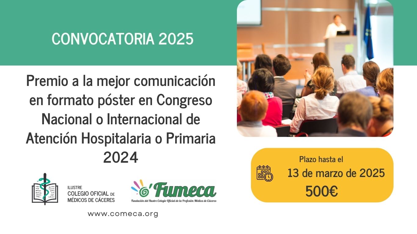 El Colegio Oficial de Médicos de Cáceres, a través de su Fundación (FUMECA), convoca un año más el premio a la mejor comunicación en formato póster en Congreso Nacional o Internacional de Medicina Hospitalaria o Atención Primaria con el fin de fomentar y dar a conocer la actividad científica de los colegiados,