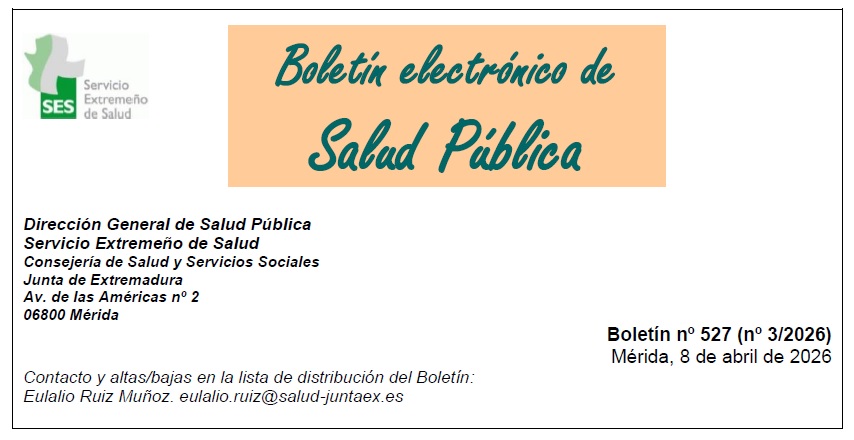 La Dirección General de Salud Pública del Servicio Extremeño de Salud ha publicado el Boletín electrónico de Salud Pública de Extremadura nº 527, una herramienta de actualización dirigida a profesionales sanitarios que recopila las principales novedades en salud pública.